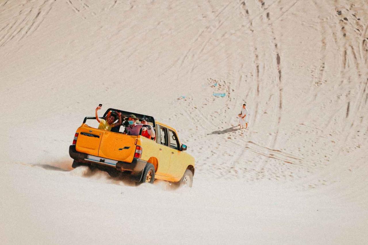 Một trong trải nghiệm gây thích thú nhất đối với du khách khi đến với tour Phan Thiết chính là vi vu đồi cát bằng xe jeep hay mô tô. Dịch vụ cho thuê xe jeep ở đây rất phổ biến. Giá thuê xe khoảng 300.000VND/ 20 phút /xe nhỏ và 800.000 VND/ 30 phút/ xe to. Giá thuê mô tô sẽ rẻ hơn. Nghiêng ngả trên những đồi cát gập ghềnh, thu trọn vào tầm mắt những triền cát mênh mông chắc chắn sẽ là một trải nghiệm khó có thể quên.